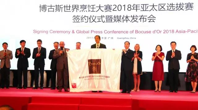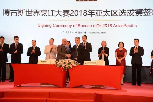 8月23日,嶺南集團(tuán)與法國智奧集團(tuán)在花園酒店正式簽署《合作協(xié)議》,合作舉辦2018年博古斯世界烹飪大賽亞太區(qū)選拔賽。廣州從與新加坡和東京的激烈競爭中脫穎而出,首次成為賽事舉辦城市。廣州市委常委蔡朝林、廣州市商務(wù)委陳杰主任、嶺南集團(tuán)馮勁董事長、法國智奧集團(tuán)吉農(nóng)主席和數(shù)十位國際國內(nèi)餐飲產(chǎn)業(yè)屆嘉賓和新聞媒體代表共同見證了這一具有歷史意義的時刻,并參加了隨后舉行的全球媒體發(fā)布會。